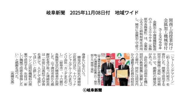 2025.11.10 【メディア掲載】当社が仲介したユーエスウラサキ株式会社様から関市へのふるさと納税の贈呈式がメディアにて紹介されました! 当社が仲介したユーエスウラサキ株式会社様から関市へのふるさと納税贈呈式がメディアにて紹介されました! 2025年11月6日 中日新聞 電子版→こちら 2025年11月8日 岐阜新聞 電子版→こちら