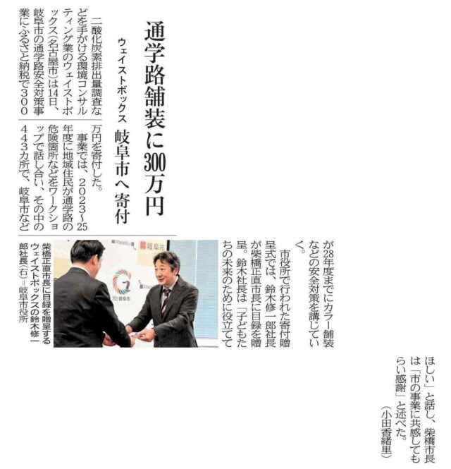二酸化炭素排出量調査などを手がける環境コンサルティング業のウェイストボックス様からのご寄附は、岐阜市内の通学路における安全対策事業(2028年度までのカラー舗装など)に活用されます。