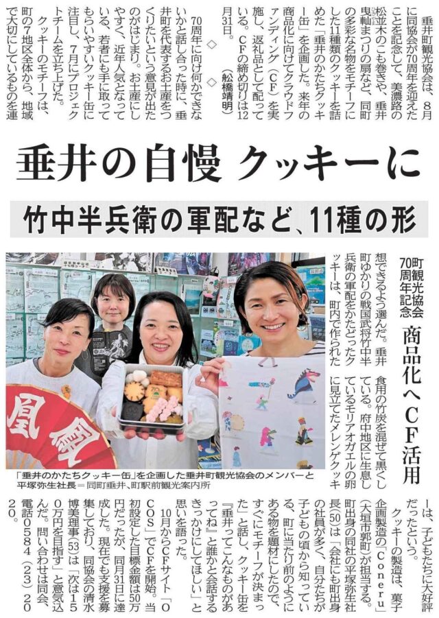 クラウドファンディングプラットフォームOCOSの「ナニコレ!? 地元愛がギュッと詰まった新名物⭐︎垂井クッキー缶 を作りたい」プロジェクトがメディアで紹介されました。